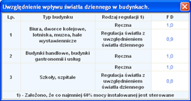 Na podstawie wybranych informacji z listy rozwijalnej zostanie dobrany współczynnik uwzględniający wykorzystanie światła dziennego w oświetleniu FDO . Doboru można dokonać również za pomocą przycisku Tablica, po naciśnięciu którego otworzy się tabela z Rozporządzenia.